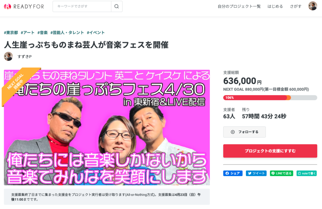 本プロジェクトは4月30日のフェス開催が一旦のゴールとなりますが、その後、同じやり方で崖っぷちな状態からでも復活できることを多くの芸人や音楽関係者の後輩、または一般の人にまで知ってもらい、サポートを含めて社会貢献活動として広げていきたいと思っています。
